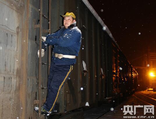 圖五、車站制動員徐鵬對剛送到貨場的車輛進行人力制動,防止車輛溜逸