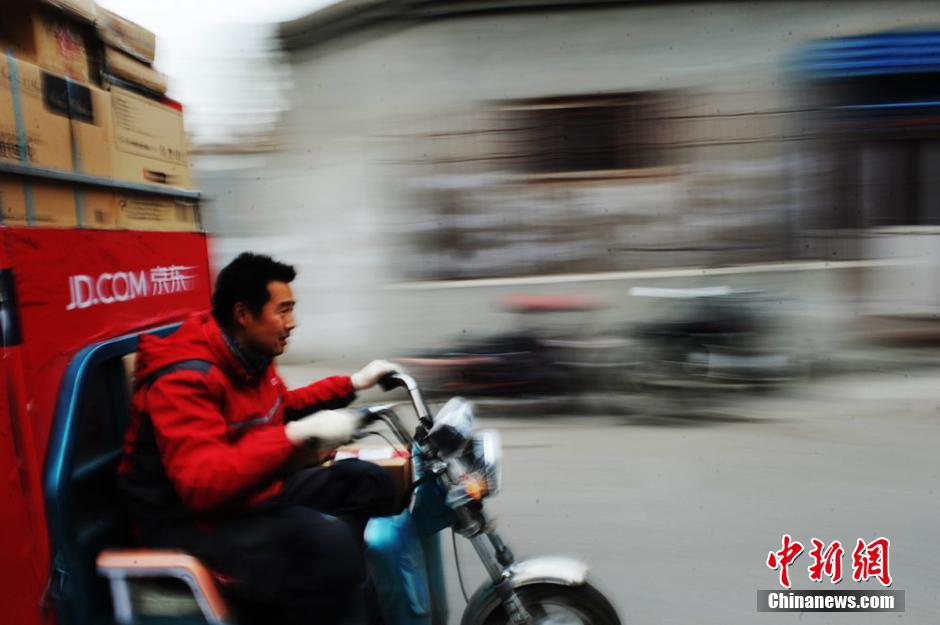 央廣網河南分網消息 11月11日傍晚,一場斷斷續續的零星小雨加劇了甘肅省會蘭州初冬的寒意,戶外逼人的寒風催促著城區上班一族回家的步伐。忙得焦頭爛額的京東派送員蒲澤民一天沒顧得上吃飯,此時他又駕駛著一輛滿載貨物的三輪摩托,直奔回家高峰期的各個住宅小區“倒時差”送貨。 楊艷敏 攝