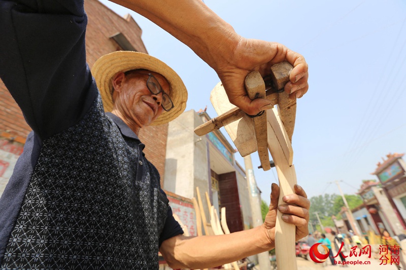 2016年5月20日,河南省滑縣老店鎮第三營村“小滿”會上,當地農民正在現場制作、銷售打麥場上離不了的農具——木锨。