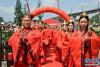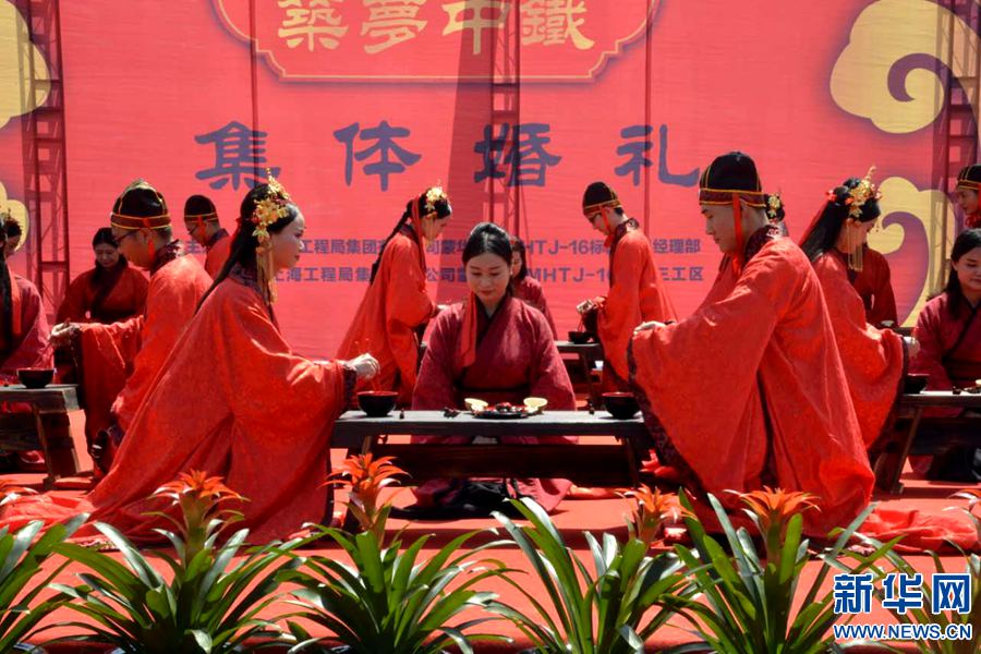 現(xiàn)場10對新人身著漢服,伴隨著大氣渾厚的奏樂,在數(shù)百名同事、農(nóng)民工朋友和當(dāng)?shù)卮迕竦墓餐娮C下,先后行了沃盥禮、結(jié)發(fā)禮、奠雁禮、同牢禮、合巹禮、三拜禮、執(zhí)手禮,結(jié)成百年之好。 -