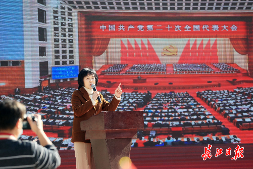 音樂展示《國際歌》《春天的故事》《理想》、聽歌識曲《東方紅》《游擊隊歌》《紅梅贊》、湖北大鼓《二十大精神指航向》、全場合唱《沒有共產黨就沒有新中國》……課程圍繞黨的二十大主題、大會報告的主要內容和核心要義進行了系統闡述,同時音樂與黨課互相交融,現場觀眾在紅色經典曲目中感受一幕幕或悲壯激烈,或輝煌壯麗的黨史畫卷。