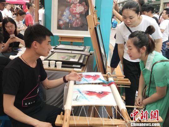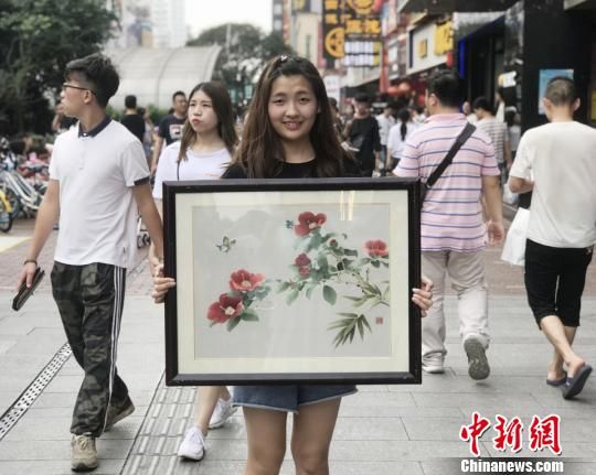 湖南工藝美術職業學院的學生街頭展示湘繡作品。 唐小晴 攝