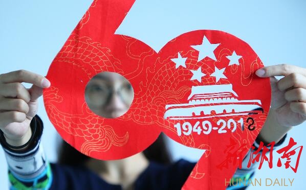 9月27日,大學生展示創作的慶國慶剪紙作品。近日,南華大學舉辦“剪紙迎國慶”主題活動,邀請剪紙藝人來校指導大學生剪紙藝術愛好者創作,迎接中華人民共和國成立69周年。 肖與軒 曹正平攝影報道