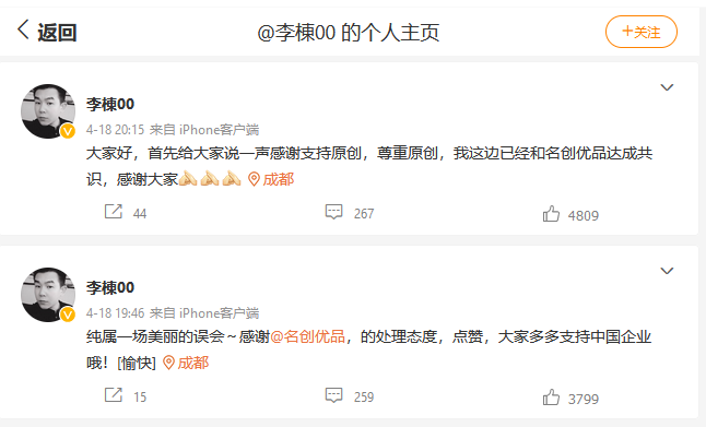 然而,很快,“戲劇化”的一幕出現了。18日晚間,設計師@李棟00 改口了。該名設計師連發兩條微博回應稱,“純屬一場美麗的誤會”,還為名創優品點贊,表示已和名創優品達成共識,并在接受媒體采訪時表示,將與名創優品合作1-3年。
