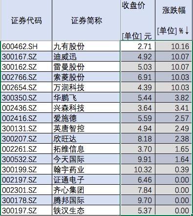 從10月24日的盤(pán)面表現(xiàn)來(lái)看,在17只個(gè)股中,除了4只個(gè)股停牌,其余全部實(shí)現(xiàn)上漲,其中,九有股份、迪威迅、雷曼股份、索菱股份、萬(wàn)潤(rùn)科技等5只個(gè)股報(bào)收漲停,華鵬飛、興森科技、愛(ài)施德、英唐智控、欣旺達(dá)漲幅超過(guò)2%。