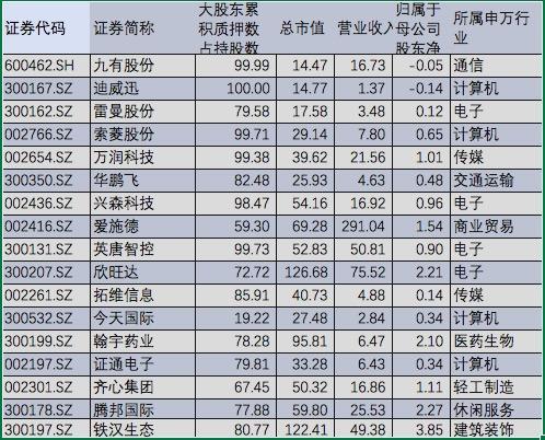 而從大股東累積質(zhì)押數(shù)占持股數(shù)比例來(lái)看,上述17家上市公司的大股東累積質(zhì)押數(shù)占持股數(shù)比例都不小,均超過(guò)50%,其中超過(guò)90%的有6家。九有股份、索菱股份、萬(wàn)潤(rùn)科技、英唐智控大股東累積質(zhì)押數(shù)占持股數(shù)比例超過(guò)99%,而迪威迅大股東累積質(zhì)押數(shù)占持股數(shù)比例為100%,也就是說(shuō)迪威迅的大股東已經(jīng)質(zhì)押了所持有的全部股份。