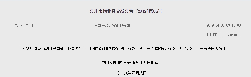 4月8日,中國央行公開市場不開展無逆回購操作,為連續第13日暫停逆回購操作。當日無逆回購到期。“目前銀行體系流動性總量處于較高水平,可吸收金融機構繳存法定存款準備金等因素”,央行在公告中這樣解釋。