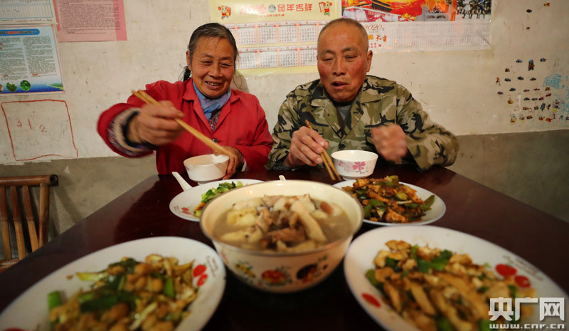 1月24日,大年三十,江西省吉安市泰和縣澄江鎮官溪村9組脫貧戶康水根夫婦正在吃年夜飯。