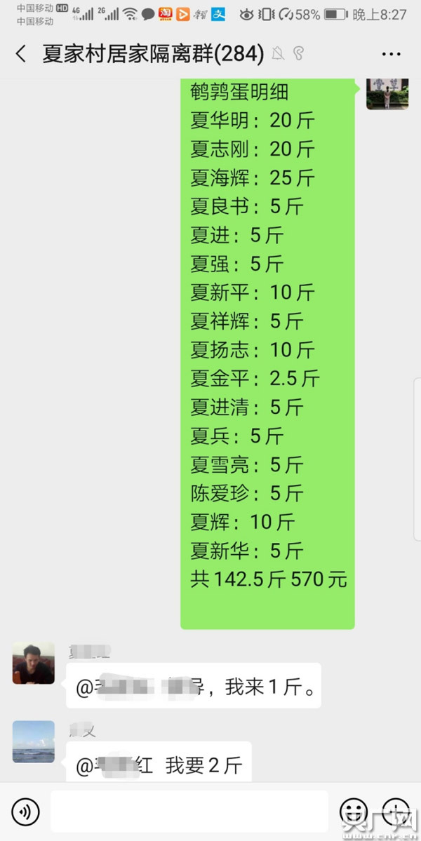 頓時,同田鄉的婦聯工作群、機關干部工作群、疫情信息閉環工作群等近10個微信群里熱鬧了起來:“可以送貨上門嗎?行的話來20斤。”“我要五斤”、“我食堂里要60斤”....隨著一條條信息推出,下單的也接連不斷,聽說是貧困戶家的鵪鶉蛋積壓,不少干部在自己的朋友圈也轉發起來。夏家村的居家隔離群更是接起了長龍,短短一個小時,就有20多戶村民訂購了近150斤鵪鶉蛋。在大家的幫助下,通過微信群、朋友圈以及村民自發訂購等方式,僅15號一天就下單售出鵪鶉蛋500多斤,這下可把吳華樂壞了,皺著的眉頭也打開了。他說:這次多虧了扶貧干部,解了他的燃眉之急,他堅信,有黨和政府的關心和依靠,他一定能發家致富。吳華還表示,疫情發生后,鎮 村干部和志愿者都忙碌防疫一線,他也要申請去當志愿者蛋,為防控疫情盡一力。