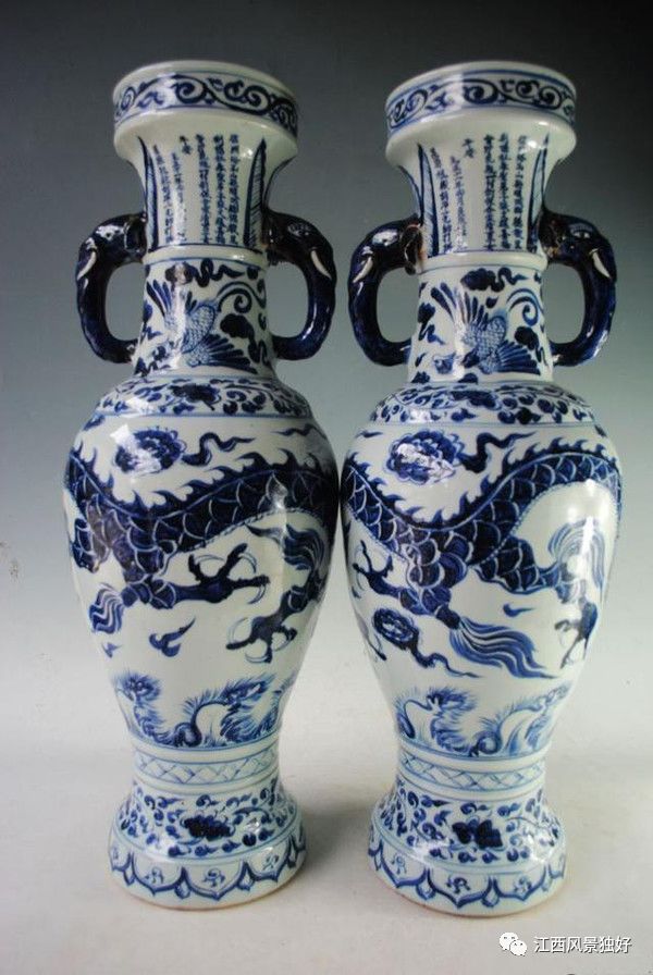 英國(guó)大維德基金會(huì)收藏。至正十一年(1351)景德鎮(zhèn)出品的青花龍紋大瓶,此瓶成對(duì),均有傷殘且器形歪斜,一只高63.3厘米,直徑21厘米;另一只高63.6厘米,寬22厘米,器型復(fù)雜,形體又大;九層紋飾,順序?yàn)槔p枝扁菊、蕉葉、飛鳳靈芝、纏枝蓮、四爪云龍、海濤、纏枝牡丹和覆蓮雜寶,耳飾,幾乎囊括元青花繪畫(huà)內(nèi)容的全部,此后凡是層次多、繪制內(nèi)容相仿佛的元青花,都被統(tǒng)稱(chēng)為“至正型”,影響力極為深遠(yuǎn)。