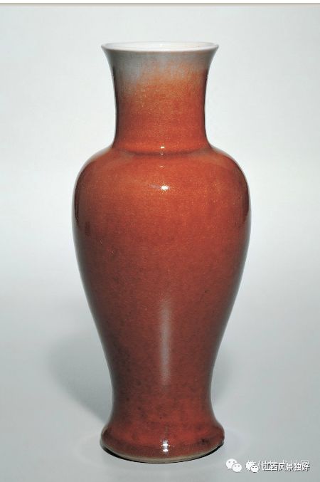 清康熙四十四年至五十一年(1705-1712),江西巡撫郎廷極奉派前往景德鎮(zhèn)御窯廠管理燒造事宜,生產(chǎn)的瓷器中有一種遙仿自宣德的紅釉器,色澤鮮艷,特別引人注目。因是郎廷極監(jiān)造之下的產(chǎn)物,所以稱(chēng)為“郎窯紅”。此瓶形制和觀音手持之凈瓶相似,故又有觀音尊之稱(chēng)。瓶口不規(guī)則的脫釉,則是郎窯紅作品的典型風(fēng)格。觀音尊器形優(yōu)美勻稱(chēng),釉色鮮紅,光彩奪目。此瓶釉質(zhì)純凈肥潤(rùn),玻璃質(zhì)感極強(qiáng)?谘丶暗鬃闾幱幸蝗Π咨吘,俗稱(chēng)“燈草邊”。瓶的內(nèi)壁施白釉,白色純正,類(lèi)雪似銀,與器表的鮮紅色形成強(qiáng)烈的對(duì)比,相映成趣,是一件成功的紅釉之作。