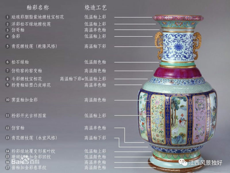 清乾隆各種釉彩大瓶,清代乾隆年間燒制,高86.4厘米,口徑27.4厘米,足徑33厘米。器身自上而下裝飾的釉、彩達(dá)17層之多,其標(biāo)志著中國(guó)古代制瓷工藝的頂峰,享有“中華瓷母”的美稱(chēng),F(xiàn)藏北京故宮博物院。