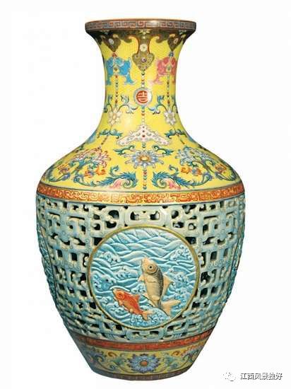 分為內(nèi)外兩瓶。內(nèi)外于瓶頸相連,內(nèi)瓶底部與外瓶?jī)?nèi)心連接,外瓶瓶身鯉魚(yú)圖案栩栩如生,配以鏤空水波紋雕花設(shè)計(jì),顯得雍容富貴,瓶頸上紅色“吉”字蘊(yùn)含吉祥如意,由外部可以看到內(nèi)瓶繪制的青花圖案。該品內(nèi)繪青花,外畫(huà)洋彩、琺瑯彩、粉彩,運(yùn)用描金,鏤空、轉(zhuǎn)心、浮雕、淺刻等多種工藝,極盡奢華、嘆為觀止,屬于清三代瓷器中的巔峰之作。乾隆粉彩鏤空“吉慶有余”轉(zhuǎn)心瓶在2010年11月11日的倫敦的拍賣(mài)中以折合人民幣5.541億元的價(jià)格成交。