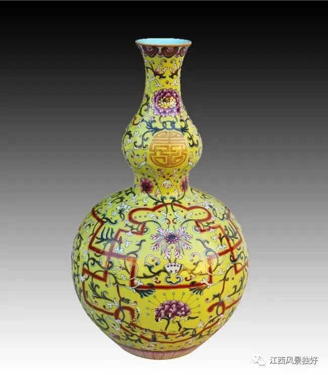 清代,當(dāng)景德鎮(zhèn)御瓷工匠采納及熟習(xí)乾隆初年開(kāi)創(chuàng)的繪畫(huà)技藝后,一種奢華繁縟的裝飾工藝——“軋道錦地”備受推崇。這種以細(xì)針狀物在釉面上刻畫(huà)卷草紋、鳳尾紋和花卉紋以表現(xiàn)“錦地”效果的工藝,于景德鎮(zhèn)日臻完善。這只長(zhǎng)頸葫蘆瓶就是這一時(shí)期的杰作。瓶上所繪紋飾色澤艷麗多變,重疊交錯(cuò),構(gòu)圖精巧,細(xì)致繽紛。該瓶在2010年10月7日香港蘇富比舉行的中國(guó)瓷器及工藝品拍賣(mài)會(huì)上,經(jīng)過(guò)足足45口叫價(jià),最終被香港收藏家張永珍以2.5266億港元購(gòu)得。