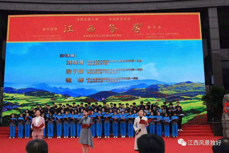 江西是革命老區,曾經為中國革命做出過巨大犧牲和巨大貢獻。江西也是全國脫貧攻堅主戰場之一。全省25個貧困縣都是重點老區縣,大部分處于贛南等原中央蘇區。其中,24個為國定貧困縣,1個為省定貧困縣。2020年4月26日,江西省政府召開新聞發布會,正式宣布于都縣、興國縣、寧都縣、贛縣區、鄱陽縣、修水縣、都昌縣7個貧困縣(區)脫貧退出,這是我省第四批次貧困縣脫貧退出。至此,全省25個貧困縣全部脫貧退出,意味著歷史性解決江西老區群眾絕對貧困問題,這是我省扶貧開發史上具有里程碑意義的重大事件。對此,開場曲《老表的掌聲響起來》生動表達了老區群眾的激動與祝福:“老表的掌聲響起來,映山紅花兒在盛開。脫貧宣言暖民心,決勝小康大步邁!老表的掌聲響起來,千萬顆心兒在期待。鄉村振興奏凱歌,美好生活樂開懷……老表的掌聲響起來!江西好運當頭,老表幸福常在!”