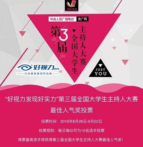 2016年8月26日,中央人民廣播電臺第三屆全國大學生主持人大賽“好視力發現好實力”最佳人氣獎選手票選活動全面開啟,進入全國復賽的71名選手參與了本次票選活動。