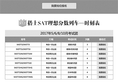 北京越來越多的公立學(xué)校開設(shè)了國際部、出國班,被稱為“洋高考”的SAT、ACT考試歷來是中國學(xué)生申請(qǐng)去美國留學(xué)前必須要參加的重要考試。北京青年報(bào)記者近日發(fā)現(xiàn),由于內(nèi)地沒有SAT、ACT考點(diǎn),考生必須要遠(yuǎn)赴境外趕考。隨之而起的一種名為“SAT考團(tuán)”的商業(yè)項(xiàng)目已經(jīng)潛入了北京高中生之中。他們?cè)诼眯猩缤瞥龅摹癝AT考團(tuán)”或是學(xué)校組織的SAT考團(tuán)帶領(lǐng)下,遠(yuǎn)赴香港、澳門、臺(tái)灣地區(qū),或是日本、韓國、泰國、新加坡等周邊國家的考點(diǎn)參加美國“洋高考”。