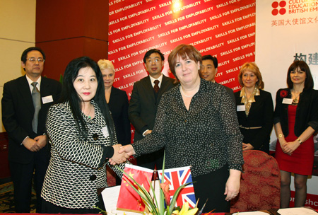 教育部職業教育與成人教育所副所長高瑛(左)和英國大使館文化教育處參贊白瓊娜女士(右)簽署合作協議