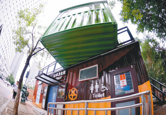 7月8日,在沈陽和平區(qū)咖啡(酒吧)街,一處二層文化主題集裝箱公廁亮相。一層為公共衛(wèi)生間,二層為公共休息區(qū)域,設手機充電器等便民設施。(記者 張文魁攝)