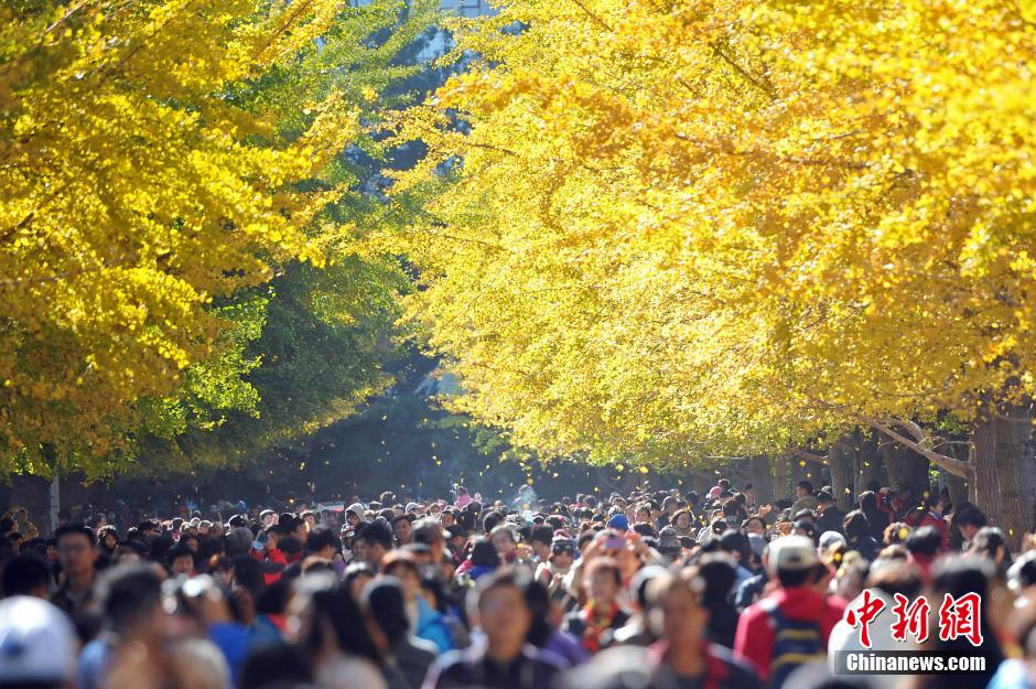 10月24日,遼寧沈陽,一陣風過人群上空下起“金片雨”。近日沈陽持續降溫,遼寧大學的銀杏泛黃并落葉增多,進入最佳觀賞期,吸引了人們前來觀賞金秋美景。 中新社記者 孫昊聲 攝