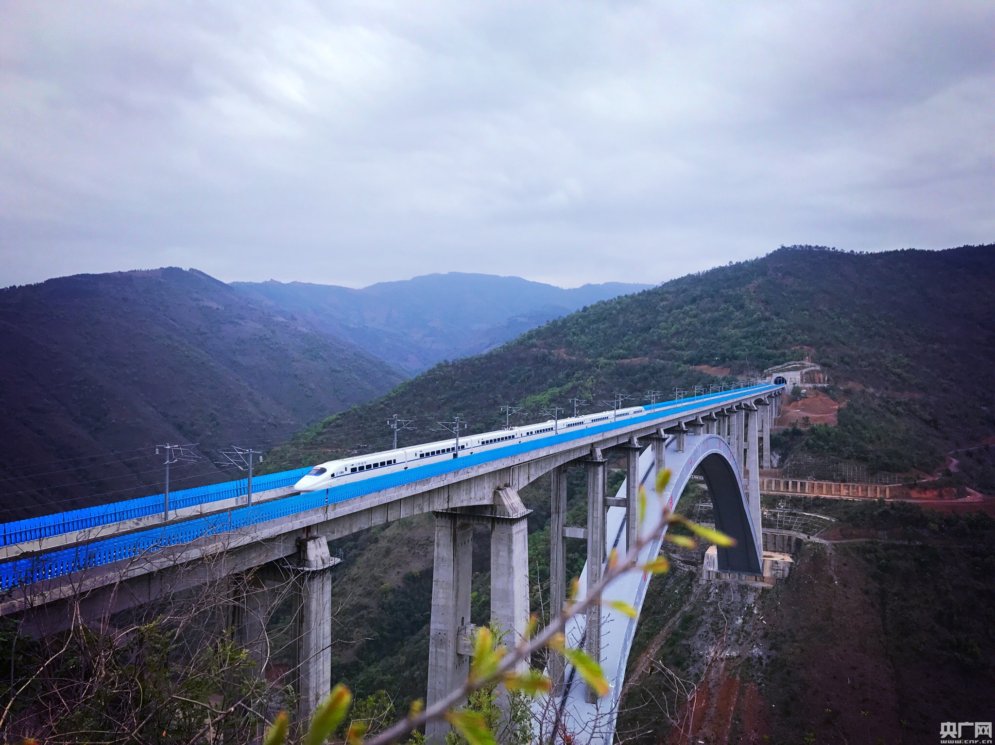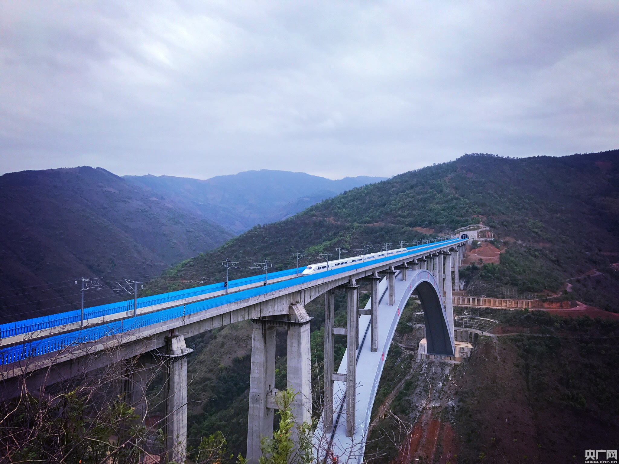 2017年4月23日,紅河,動車組列車在云桂鐵路南盤江特大橋上飛馳。 央廣網紅河4月23日消息(記者何微)近日,由中國鐵路總公司組織的“發現最美鐵路”系列活動在滇、桂舉行,本期主題“夢想飛躍云桂間”。23日,活動走進云南省紅河哈尼族彝族自治州,探訪動車組列車在云桂鐵路上飛馳“云端”的絕美景色。 據悉,云桂鐵路全長710公里,橋隧總長500公里,設計車速200公里至250公里,2016年12月28日全線開通運營,從昆明到南寧的行車時間由原來的12個小時縮短為5個小時。成為促進廣西、云南多民族地區經濟發展的一條致富路。 在紅河州彌勒市與文山州丘北縣交界處,赤色的南盤江水蜿蜒前行,江面上270米高空處,云桂鐵路南盤江特大橋凌空而立,宛如一道飛虹騰云而臥,動車組列車在橋上行駛猶如飛馳在“云端”。 南盤江特大橋,全長852米,是目前世界最大跨度客貨共用高速鐵路特大橋。橋面凌空高出江面270米,大橋兩岸都是懸崖,山勢陡峭,坡度近50度,地形地貌復雜,山體滑坡、泥石流經常發生。 南盤江特大橋讓天塹變通途,列車伴隨著南盤江水在橋上飛馳,成為云嶺大地上一道靚麗的風景線。 -