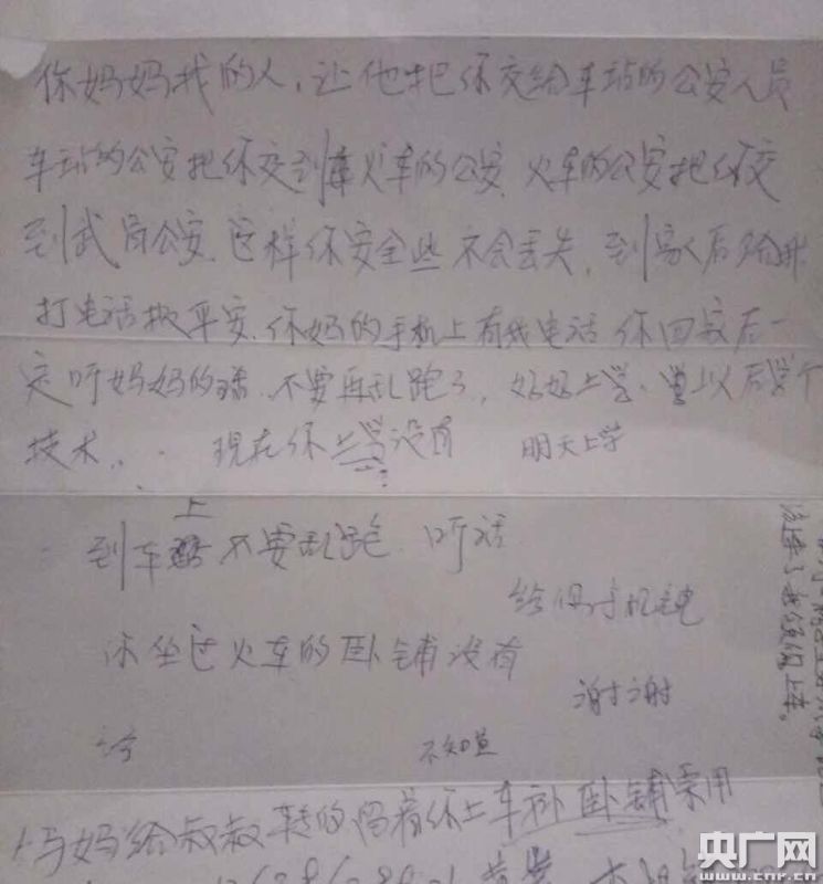 事情還要從當天晚上九點說起,邢臺站派出所值勤警長高現賓在候車室巡視時,一名十來歲的女孩一邊流淚一邊焦急的比劃著手勢前來求助。民警立刻明白這是一名聾啞女孩,隨即將女孩先帶到執勤室?匆娦」媚镆轮鴨伪,凍的瑟瑟發抖,民警給女孩端來熱水,給她買了面包,女孩的情緒也漸漸穩定下來。這時,高警長找來紙筆寫下:“小姑娘你怎么了?”,小姑娘在紙上回復道:“警察叔叔,幫幫我吧,我再也不這樣離家出走了,我想回家,我想找媽媽”,一邊寫,一邊流眼淚。就這樣,民警與小女孩在紙上一句句的交流后得知,小女孩名叫秦某,武漢黃坡人,因父母在家吵架,還在青春叛逆期的她一氣之下,離家出走乘坐火車來到了邢臺,從未自己出過遠門的她,到達邢臺下車之后便開始后悔,正在自己傷心無助的時候遇到了車站巡視的民警。