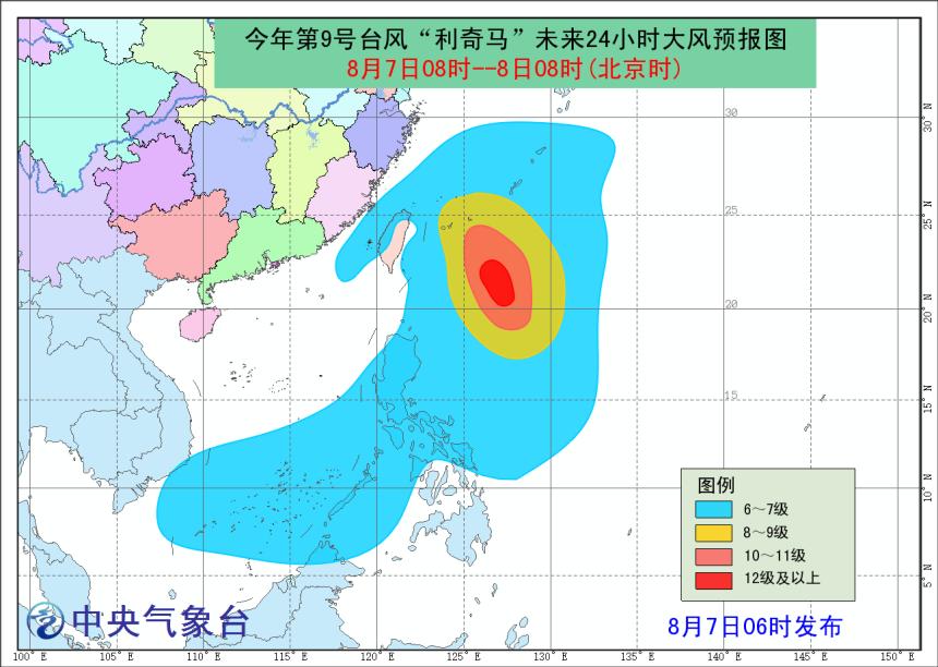 8月7日08時-8日08時,今年第9號臺風“利奇馬”未來24小時大風預報圖(圖片來源:中央氣象臺)