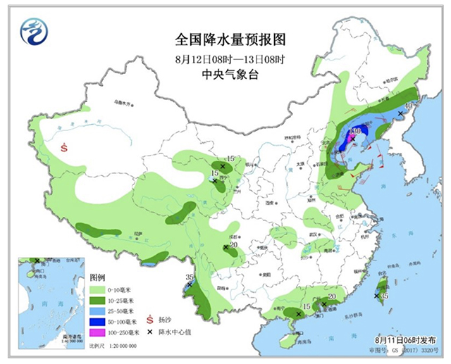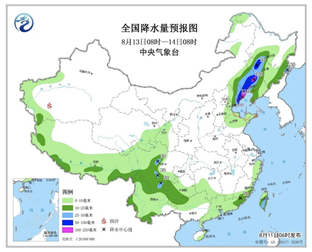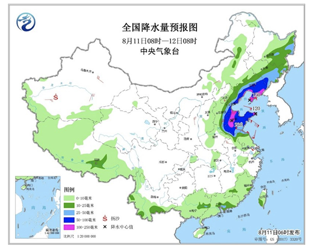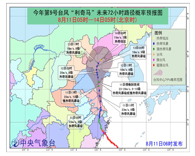 受“利奇馬”和冷空氣共同影響,未來(lái)三天,黃淮中東部、華北東部、東北地區(qū)大部等地有大到暴雨,部分地區(qū)大暴雨,局地特大暴雨。11日,山東、河北東部、天津東部、遼寧中南部、吉林東南部等地有暴雨,其中,山東中部和半島東部、遼寧南部等地的部分地區(qū)有大暴雨(100~230毫米);12日,遼寧西南部、河北東北部有暴雨,局地大暴雨;13日,吉林西部、遼寧西部、內(nèi)蒙古東部偏南地區(qū)、河北東北部等地的部分地區(qū)有暴雨,局地大暴雨。