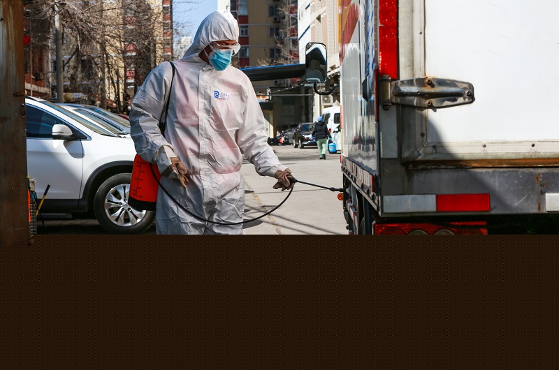 將醫療廢物裝車后,北京環衛集團固廢物流公司醫廢中心職工對作業車輛車身消毒(北京環衛集團供圖)