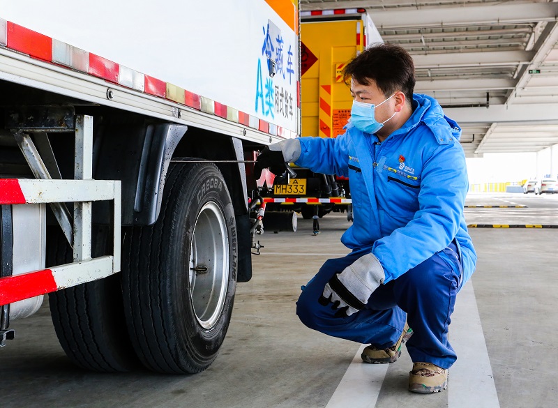 發車前,北京環衛集團固廢物流公司醫廢中心職工王廣檢查作業車輛(北京環衛集團供圖)