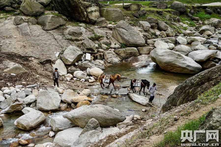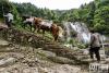 騾馬馱著石材艱難上山,用于翻修景區老路。 -