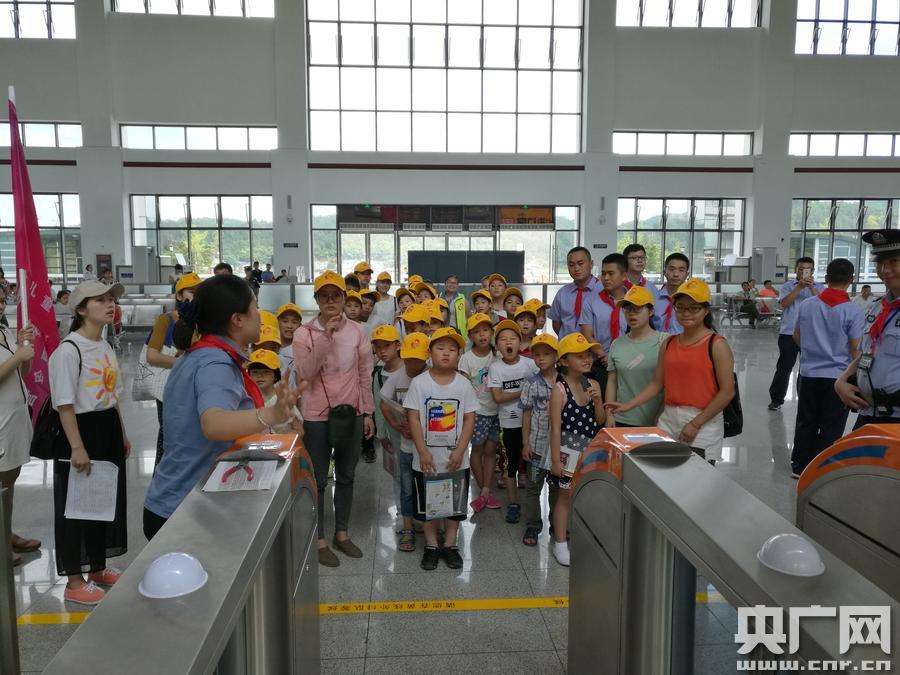 凱里車務段邀請留守兒童“領略高鐵文化”(央廣網發 龍幸攝) 央廣網重慶7月21日消息(記者劉湛 通訊員彭亮 龍幸)7月19日,凱里車務段三穗站聯合常春藤快樂兒童之家、三穗站線路車間舉辦主題為“領略高鐵文化、熟知乘車安全”的拓展活動,組織35名留守兒童及10名大學生志愿者走進高鐵車站,實地觀摩中國高鐵的發展,開拓留守兒童與大學生志愿者的文化視野。 -