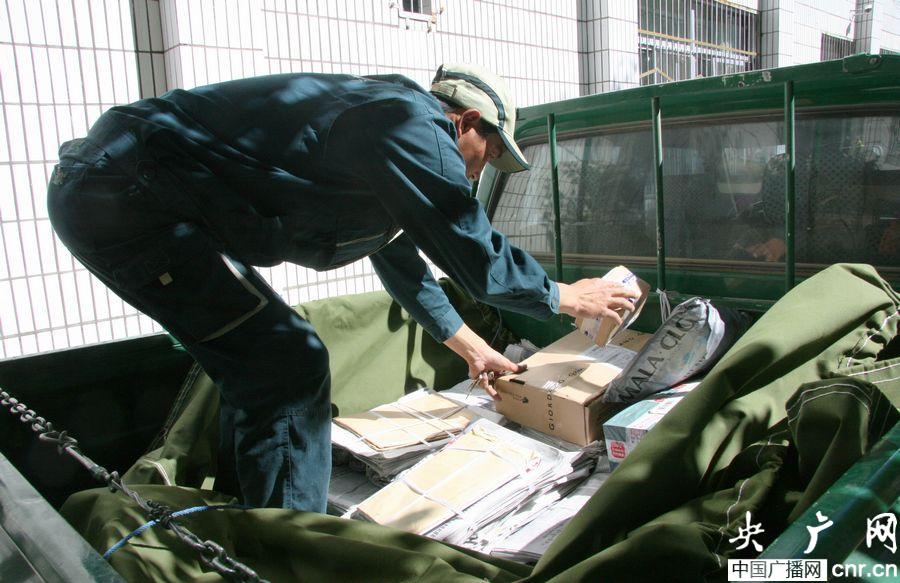 格桑正在認真清點今天要派送的郵件和報紙(央廣網記者 普布次仁 攝)