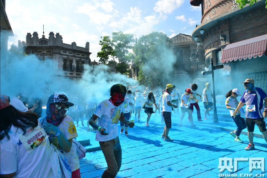 當天上午9點,在海口觀瀾湖華誼馮小剛電影公社影人星光大道路口正式開跑,同時在電影公社“1942街”鐘樓廣場、大型攝影棚拍攝區(qū)、觀瀾湖、蘭桂坊、海口石礦湖、觀瀾湖火山巖礦溫泉500米龍脊長廊處都設有人工噴彩點,讓參與者除了跑出夏日激情,更能感受到觀瀾湖的魅力與活力。特別在電影公社“1942街”鐘樓廣場設有“藍色”人工噴彩,一條條長龍似的青年隊伍跑過狂噴的彩粉時,頓感頭頂上的藍天和地上變藍的青石板路已經(jīng)連成一線,傻傻分不清楚,美得掉渣。