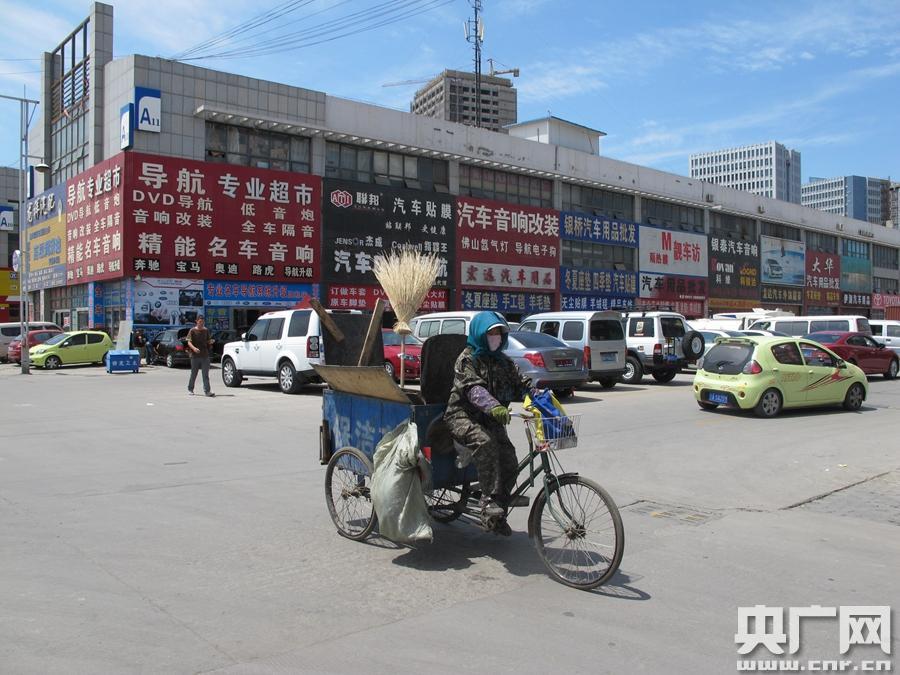 王阿姨是位于銀川國際汽車城的清潔工,今年46歲。短暫的午休后,她從庫房里騎出腳踏三輪車,開始了下午的工作。平時都是兩個人的活兒,今天因為另一個工人調休,她得一個人做。太陽將大地烘烤得象似要冒出熱汽來,王阿姨穿上厚厚的工作服來保護自己,以免曬傷。汽車城內全是來來往往的車輛,路邊?康拇N售的車更是數不勝數。王阿姨騎著三輪車穿梭在車城內,既要注意自身的安全,還要注意不要碰壞業主的車。天氣一熱,吃水果喝飲料的人也就多了起來。清潔工們的負擔也就更重了。短短一會兒的工夫,王阿姨的三輪車一半已經被垃圾占據。