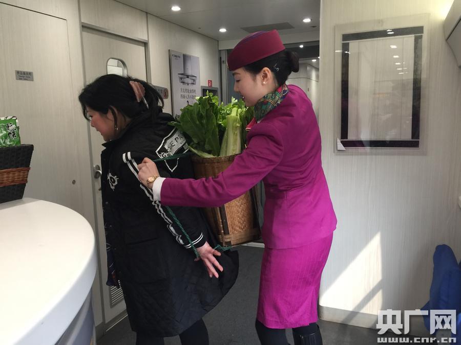 2月18日,家住資中的羅女士乘坐10點11分途經資中北站的G8508次列車到成都看望兒子?粗龜y帶滿滿一背簍的新鮮蔬菜,乘務員立即搭手幫她取下,乘務員熱心的幫忙,讓羅女士侃侃而談!艾F在你們這高鐵太方便了,我以前坐大巴要兩個多小時,現在坐高鐵半個多小時就到了!我上午從資中買的菜,中午就可以拿到成都做午飯了,真好!”