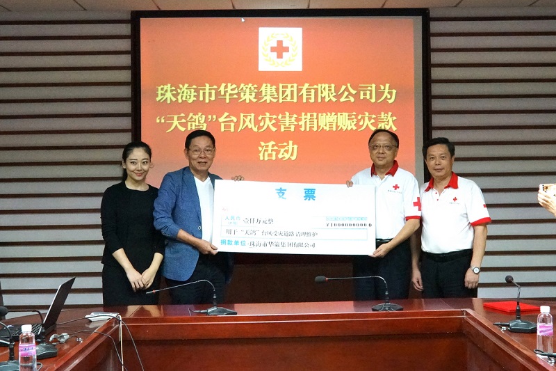 24日下午,珠海市政府副市長、市紅十字會長閻武代表珠海市紅十字會接受了珠海華策集團有限公司1000萬元人民幣捐款,該款將專用于珠海的交通道路設施恢復。華策集團主席楊峰表示,這次“天鴿”來襲,街頭綠化樹被臺風連根拔起,成了交通障礙物,給民眾出行帶來阻礙,險情揪人心,要將危機當做一次演練,加強防范危機設備的投入,做個有社會公德心的開發商,希望一份微弱之舉能盡快恢復交通道路設施,幫助市民早日方便出行。