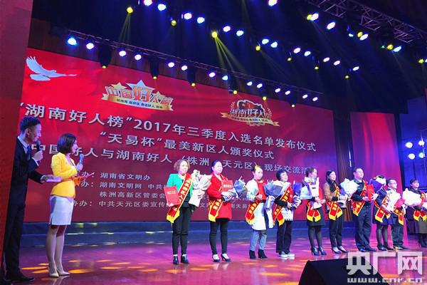 央廣網株洲11月9日消息(記者堯遙)11月8日晚,由湖南省文明辦主辦的“湖南好人榜”2017年三季度入選名單發布儀式暨中國好人與湖南好人交流活動在湖南省株洲市天元區舉行,94人(組)入選三季度“湖南好人榜”。湖南省委宣傳部副部長、省文明辦主任劉進能等領導為湖南好人榜2017年三季度入選名單揭榜。
