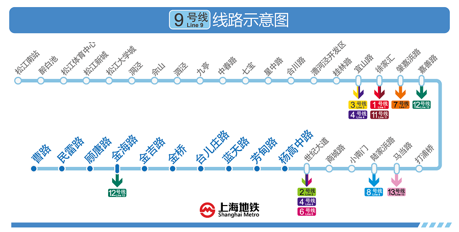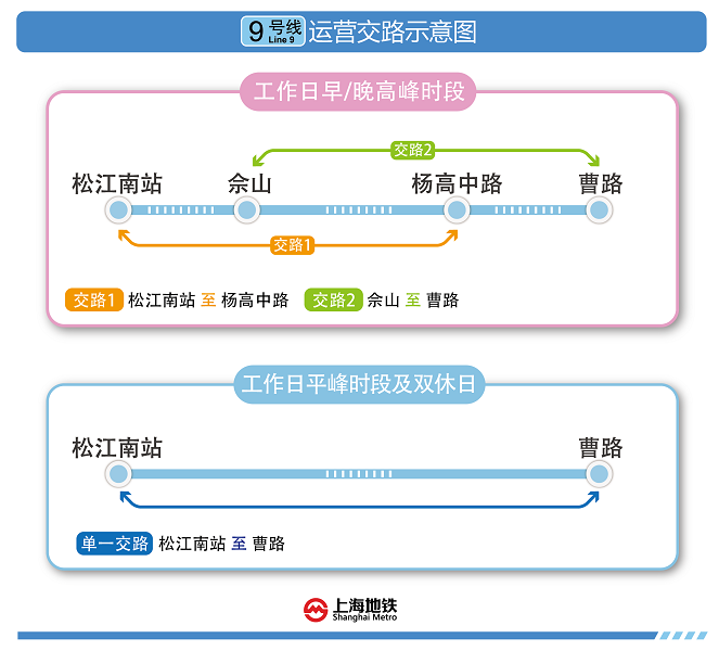 屆時,工作日早晚高峰時段9號線列車開行雙交路,兩個交路分別為:松江南站站——楊高中路站,佘山站——曹路站;工作日平峰時段及雙休日、節假日,9號線全線開行單一交路,即:松江南站站——曹路站。
