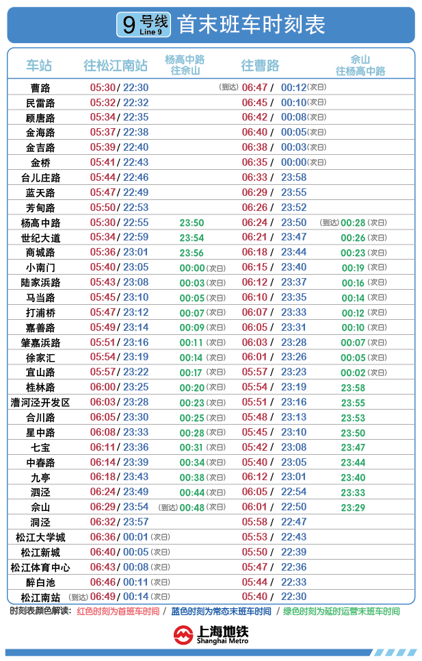 9號線三期楊高中路站——曹路站開通試運營后,9號線常態全線運營時間5:30~0:14(次日),9號線采用多點首班車發車,曹路站及楊高中路站往松江南站方向的首班車時間均為5點30分,從而9號線既有區段松江南站站——楊高中路站沿途各站的首班車時間均保持不變。而由于線路的延長,常態末班車時間均有所延后。其中,松江南站站往浦東方向常態末班車時間由目前21:50延后至22:30;楊高中路站往浦西方向常態末班車時間由目前22:30延后至22:55,楊高中路站往曹路站方向末班車23:50,全線運營服務時間較開通前延長。