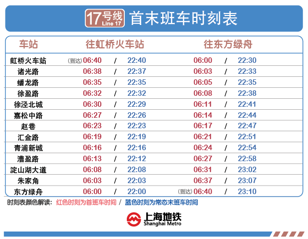 17號線東方綠舟站——虹橋火車站站開通試運營后,全線運營時間6:00~23:10。虹橋火車站站往東方綠舟站首班車6:00,末班車22:30;東方綠舟站往虹橋火車站站首班車為6:00,末班車為22:00。