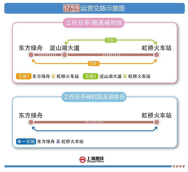 17號線虹橋火車站站——東方綠舟站開通試運營后,工作日早晚高峰時開行大小交路,其中大交路運行區段:東方綠舟站——虹橋火車站站;小交路運行區段:淀山湖大道站~虹橋火車站站。工作日平峰時段及雙休日、節假日,全線開行單一交路,即:東方綠舟站~虹橋火車站站。