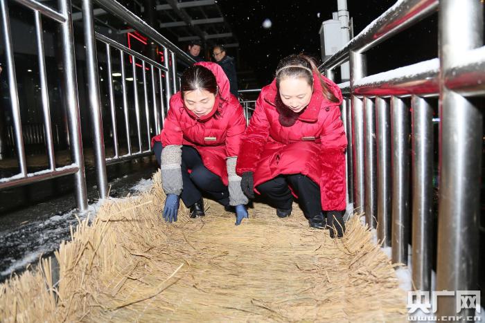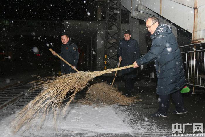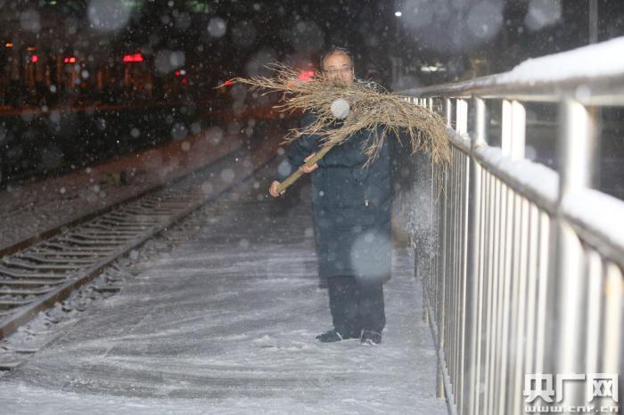 央廣網鄭州1月4日消息(記者李凡 通訊員常昊 王振興)1月4日凌晨2時許,河南省北部地區迎來今年首場降雪,中國鐵路鄭州局集團公司新鄉車務段迅速組織人員對管內新鄉、鶴壁、東明、湯陰等客運站進行除雪作業,重點做好站臺邊緣旅客登乘處的積雪清掃,并在站臺、進出站口、天橋等處鋪設防滑草墊、地毯,確保旅客乘降安全。在站內通過廣播、電子屏等形式及時發布列車時刻、雪天出行注意事項等信息,引導旅客注意出行安全。