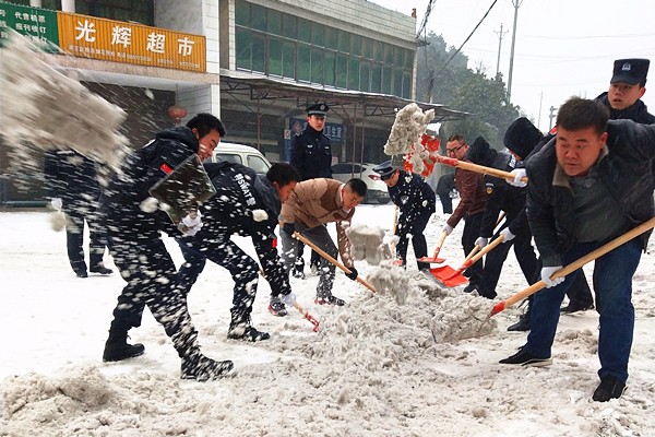 隨著大雪冰凍天氣持續(xù),當天桃江已有8條道路結(jié)冰,1月26日,桃江全境被積雪覆蓋,多條道路結(jié)冰,受阻車輛在冰雪中掙扎前行。民警“聞雪而動、見雪上路、邊下邊除”,鋪撒融雪鹽,在寒風(fēng)中揮動鍬鎬,揮汗如雨,以最快的速度搶通冰封路段。由于氣溫持續(xù)走低,加之降雪不斷,被搶通的冰面很快再次凝凍,民警持續(xù)作戰(zhàn),餓了在路邊吃碗方便面,渴了就喝口冰水,雙腳凍得沒了知覺就跑動一陣,手磨破了依舊咬牙堅持。