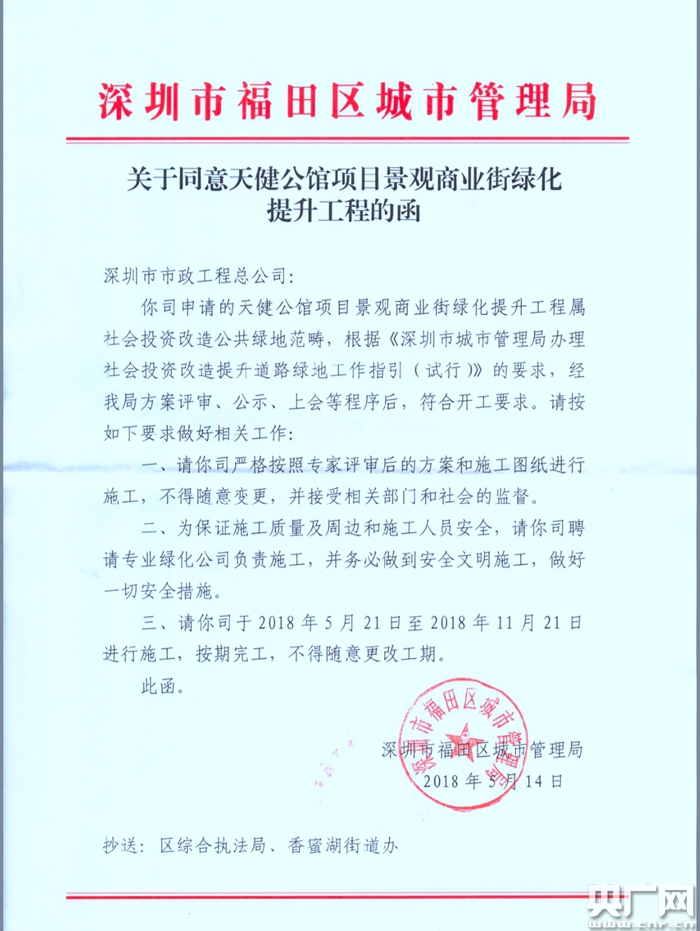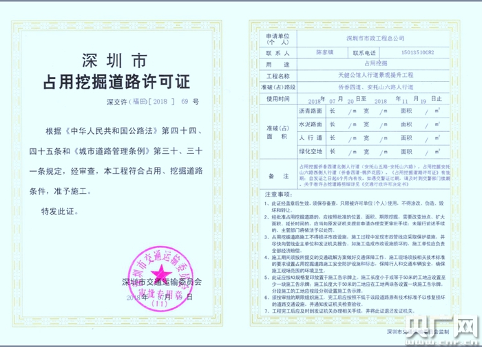 記者發(fā)現(xiàn),按照深圳市交通運輸委員會7月19日頒發(fā)的深圳市占用挖掘道路許可證中明確,天健公館人行道景觀提升工程的使用時間是截止到11月19日。深圳福田區(qū)城市管理局的批復(fù)函中施工日期截止日是11月21日。