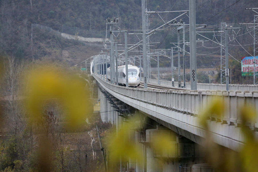 西成高鐵得利隧道洞口一列高鐵正駛過高架橋 央廣網(wǎng)發(fā) 郝黎俊攝影