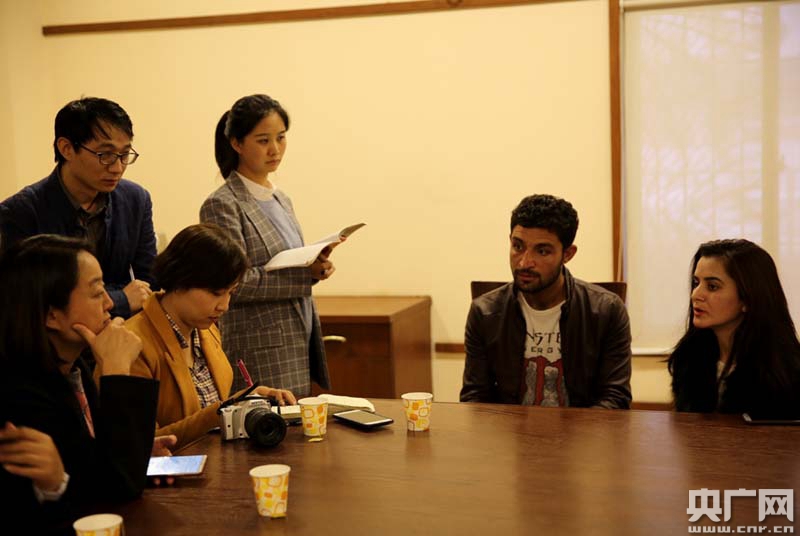 伊斯蘭堡孔子學院,明月(右)接受中國記者的采訪(央廣網記者 張江元 攝)