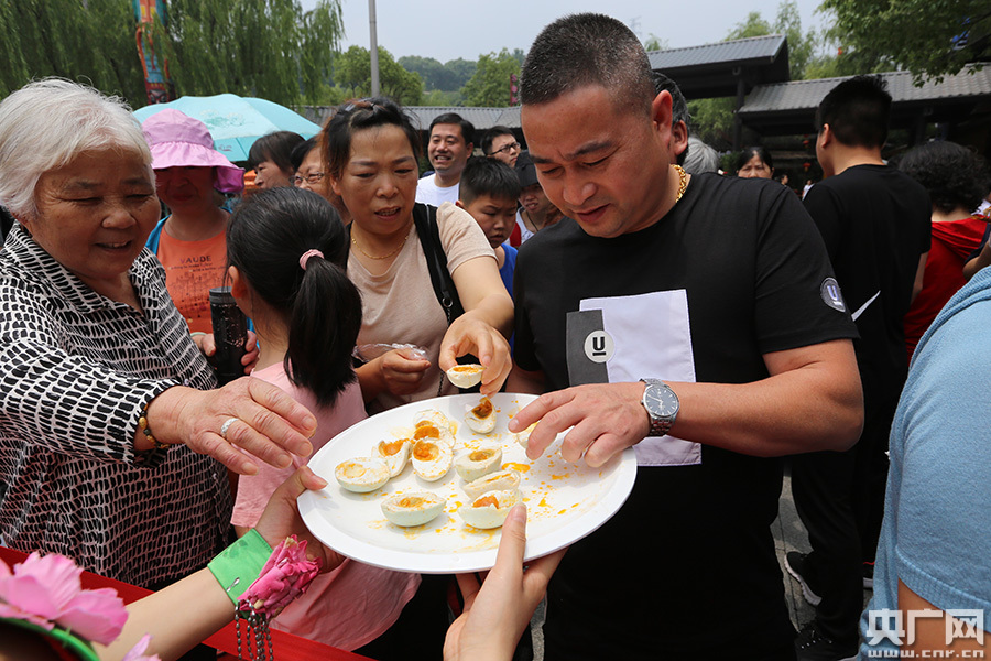 6月2日,景區工作人員為游客免費派發咸鴨蛋。(央廣網記者魏煒 攝)