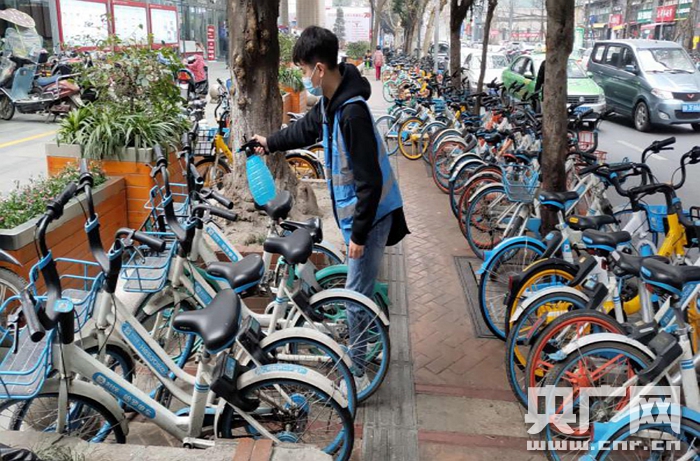 工作人員正在對共享單車消毒(央廣網發 成都錦江區綜合執法局供圖)
