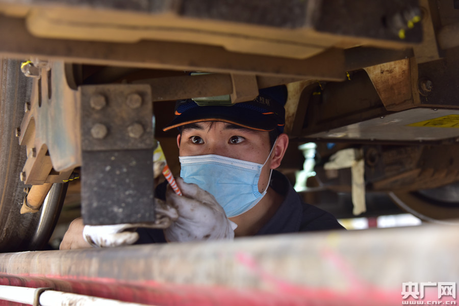 重慶北動車所動車機械師正大為動車組涂打防松標記(央廣網發 通訊員陳亞 攝)